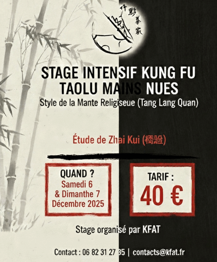 Le premier stage de la saison aura lieu les 6 et 7 décembre 2025 pour l’apprentissage et l’explication de Zhai Kue (摘盔), Tao exécuté à mains nues.